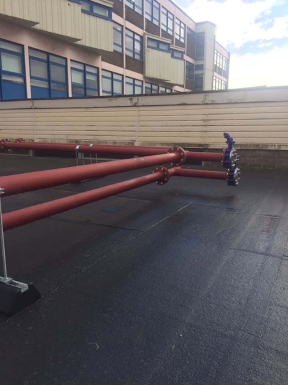 The first solution was to fabricate some new 80mm satellite pipework that ran across the roof of the FML building to feed Angela Hall. You can see them here in their red oxide finish and then later when they were fully insulated. This solved the leak, but after further extensive surveys/testing left Austin Hall without heating. Logic says that a new run of pipework across the rest of the building would have allowed it to continue to be fed by the main FML system. Cost, however, said otherwise. Fabricating and installing parallel pipes over 40m long does not come cheap, so we looked for an alternative.