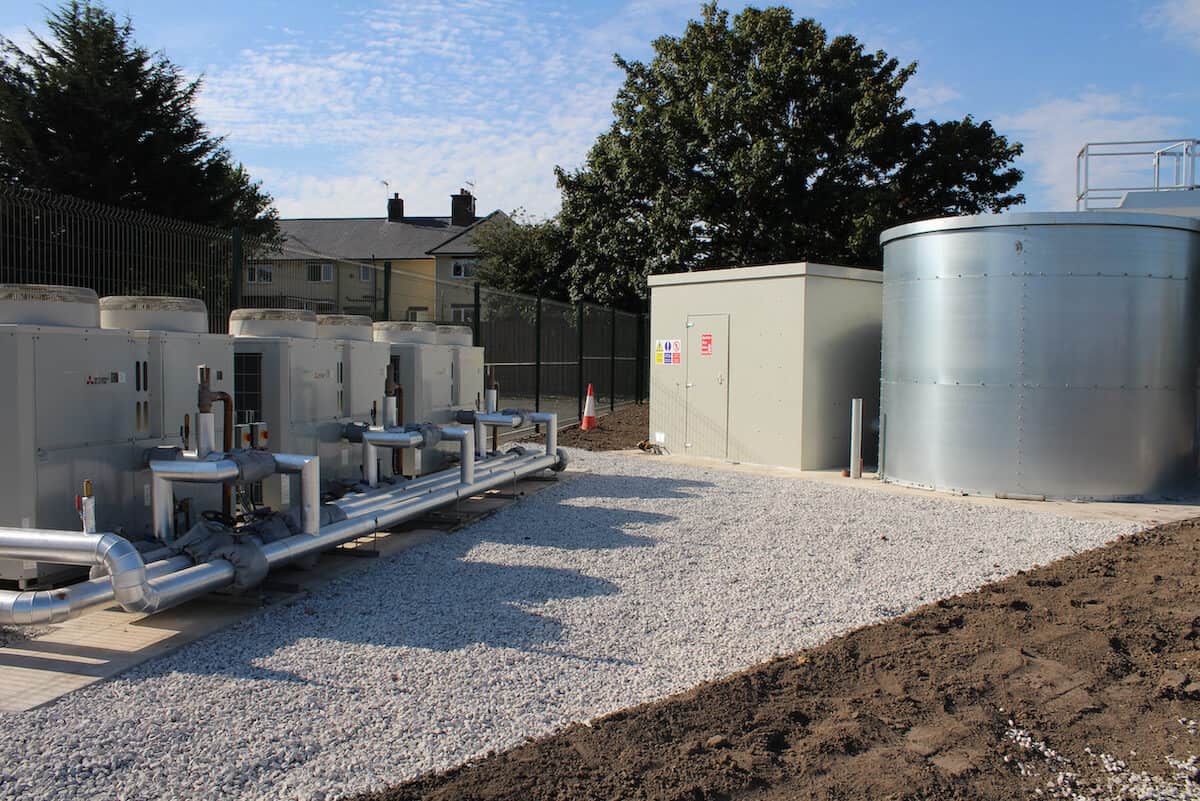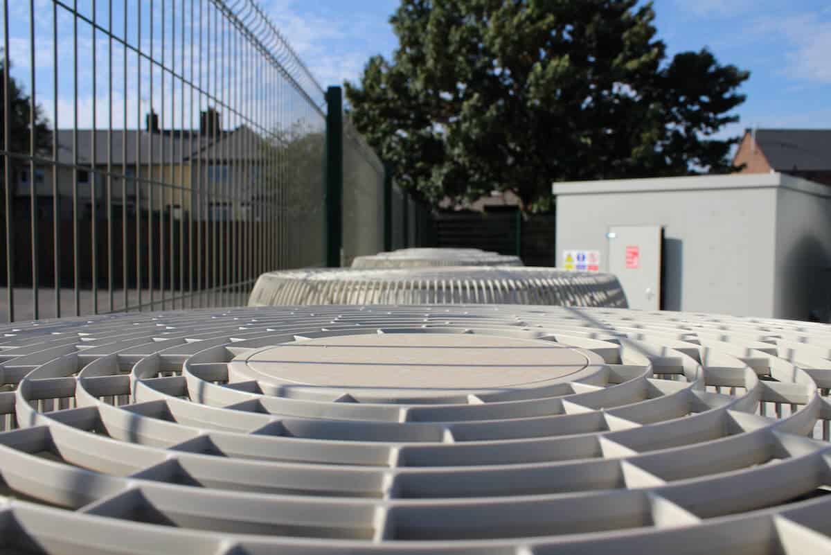 Perhaps the most visible renewable technology in use is the array of three Mitsubishi CAHV-P500 ASHP units mounted to one side of the playground area and next to the external pump house and cold water storage tank for the fire safety system.