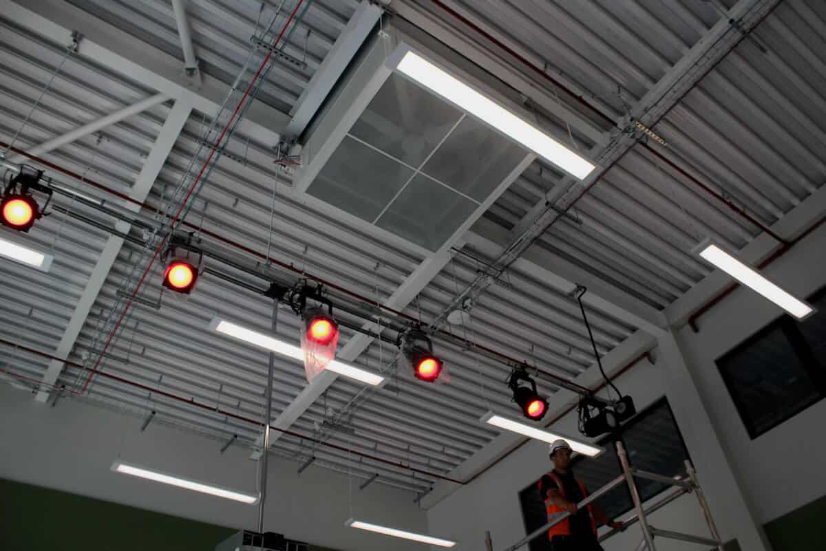 In the school hall, the system is a hybrid ventilation solution. This comprises of roof-mounted aspirated terminals to displace cool air down into the building and move the warmer, lighter air upwards to atmosphere.