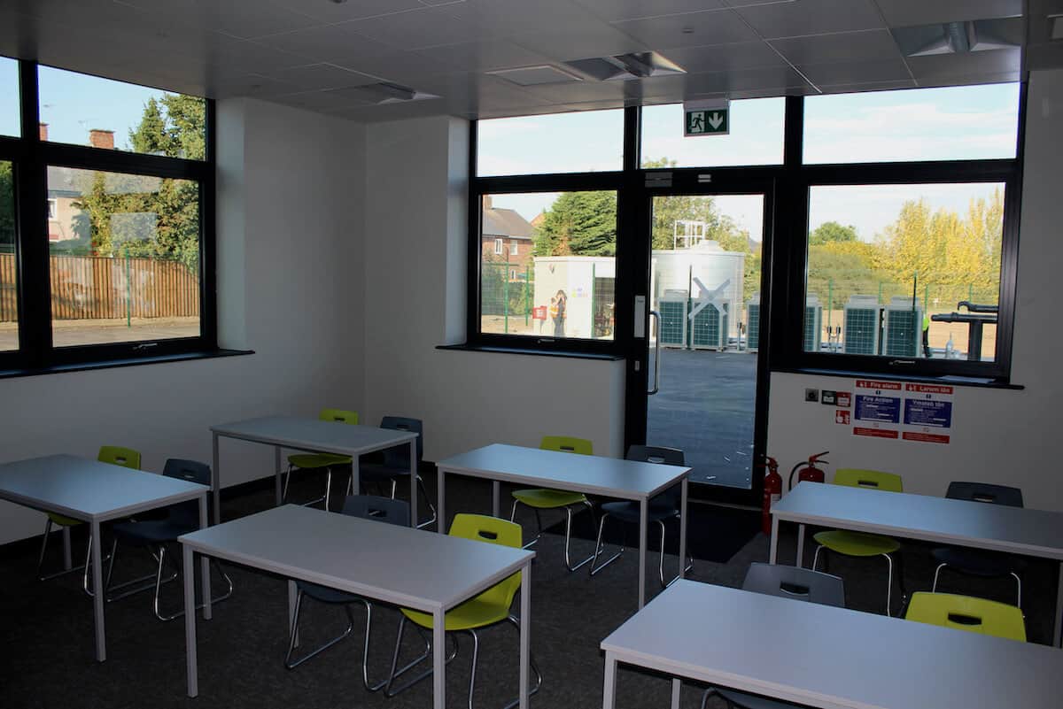 In education environments, we are also noting a huge growth in requirements for ventilation too. This build is no exception and is fitted with Breathing Building hybrid ventilation units. On warm days in the teaching spaces, the benefit of ventilation is obvious, but on a cold winters day, when fresh air is still required and temperatures need to be maintained, the hybrid mechanical ventilation system ‘mixes’ warm air with the cooler incoming fresh air to provide a healthy teaching environment, with no draughts or cold spots. These systems are designed to maintain a CO2 concentration of no more than 1,000ppm for the full teaching day. It’s been shown in repeated studies that pupils are far more able to concentrate and stay healthy when CO2 levels are kept below this level.
