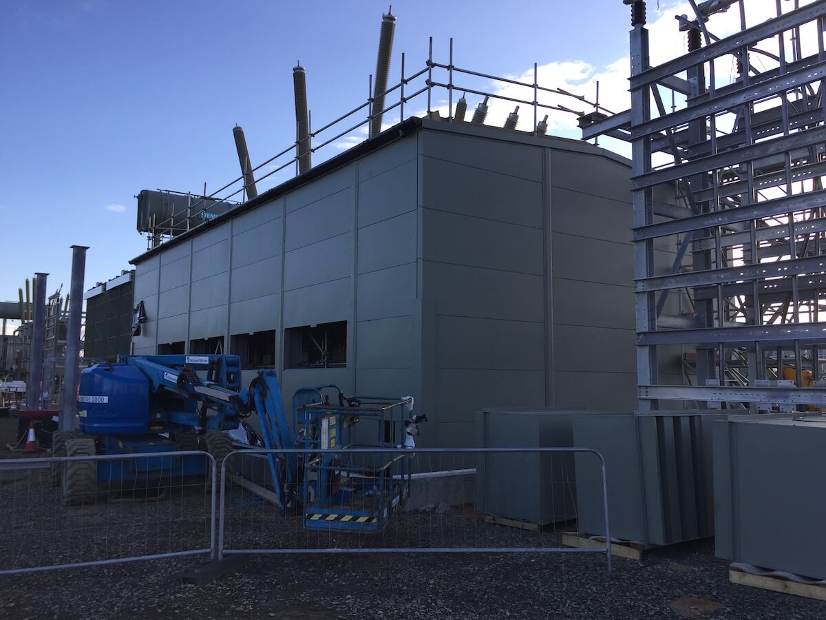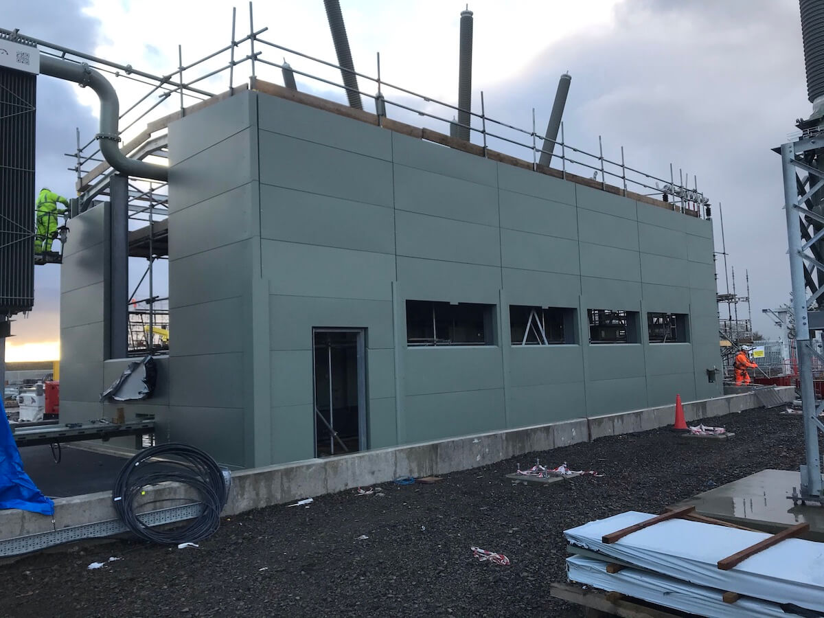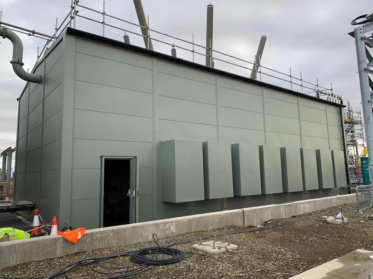 Our work to build all of the hot dipped galvanised Steel frame structures for the three Acoustic Enclosures is now complete and the fitting of the powder coated acoustic cladding is in progress.