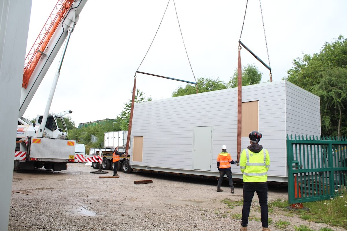 Manufactured at works the containers were constructed from a base frame with acoustic panels secured with H joiners between. The roof comprised an inverted pitch with internal rain pipes to comply with planning. For aesthetics the enclosures were timber clad.